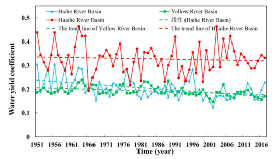 Water yield coefficients for the three first-level regions in the Huang-Huai-Hai River Basin during 1951–2017.