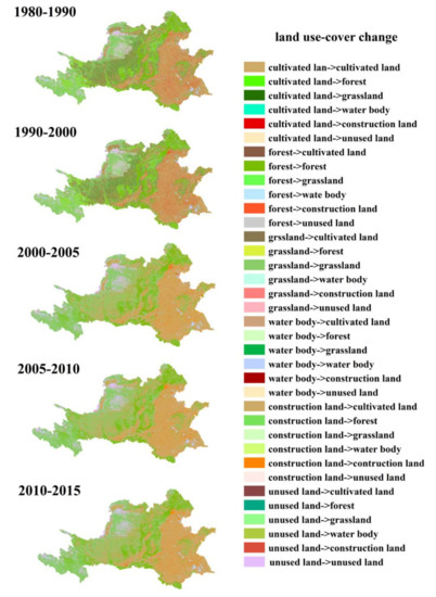 Based on the data on land use types in six periods from 1980 to 2015, the spatial distribution maps of land transformation in each period were obtained using the geospatial data statistics and calculation analysis in pairs in adjacent years. The changes in the spatial characteristics of land use in the periods 1990–1995 and 1995–2000 were inconspicuous, so they were combined into one period. According to Figure 5, the areas of cultivated land, forest, unused land, and grassland were mainly converted to construction land in the eastern part of the basin during 1980–2000, though this transformation trend decreased slightly in the later 15 years; parts of the cultivated land and grassland were also gradually converted to water body area. From 1980 to 2000, the rates of transformation of cultivated land to forest and grassland in the western part of the basin were higher than the rates in the other period. The areas of unused land such as sandy land, gobi land, and saline-alkali land in the northwest of the basin are decreasing gradually. On the whole, the other types of land were mainly converted to construction land in the east of the basin, and the other types were mainly converted to forest and grass land in the west.