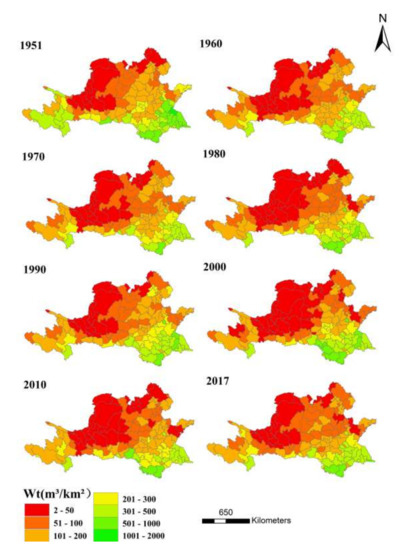 As shown in Figure 5 the total matching index of water and land resources in the basin gradually increases from the northwest to the southeast. The nine cities in the Inner Mongolia Autonomous Region and the five cities in the Ningxia Hui Autonomous Region, which are located in the northwest corner of the basin, have low total WLN matching indexes, which means their water and land resource endowments are poor, which could restrict their economic and social development. In particular, the Alxa League in the Inner Mongolia Autonomous Region has the lowest total water–land nexus matching index for many years, about 1.14 cubic meters per square kilometer. On the contrary, some cities in Jiangsu, Anhui, and Hubei provinces, located in the southeast corner of the basin, have higher total WLN matching indexes. The matching of water and land resources in these cities are more suitable for supporting sustainable social development. In this area, Anqing City in Anhui Province has the highest total WLN matching index with a multiyear average of about 826.62 cubic meters per square kilometer; the total WLN matching index in the Alxa League differs by more than 800 times. It can be seen that the endowments of water and land resources in the different regions in the basin are very different. From the perspective of time, the total matching indexes of the cities along the border of the basin have declined during 1951–2017, while the cities located in the middle of the basin have clearly increased.