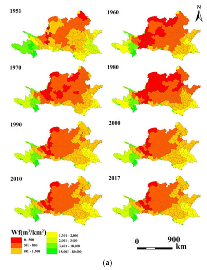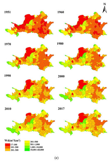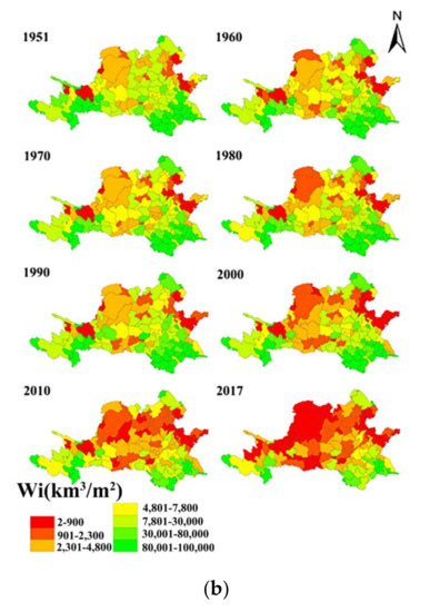 According to the spatial distribution of the domestic land WLN matching indexes in each period (Figure 7c), there are generally two living water-deficient zones. One living water-deficient zone is located in the northwest corner of the basin with a multiyear average of 35.34 mm. The second water-deficient zone is located in the middle and east of the basin, extending from Hebei Province to the southwest at a 45-degree angle. The matching state of domestic WLN extensively influences people’s healthy lives, so it is necessary to strengthen the protection and guarantee of water resources for the areas with low matching domestic WLN indexes such as Ningxia Hui Autonomous Region and Gansu Province, where the domestic WLN matching index is far below the national average, which brings great inconvenience to the lives of local people. The domestic WLN matching index in the northwestern part of the basin is highly consistent with the total WLN matching index, but there are big differences between them in other areas of the basin. Beijing, Tianjin, and Hebei Province have low total WLN matching indexes, but they have high domestic WLN matching indexes. This is mainly because these areas are important political, economic, and cultural centers of the basin with dense populations. Therefore, it is necessary to increase the protection of the domestic water and land resources in this area. During 1951–2017, the areas with high domestic WLN matching indexes in the whole basin have gradually increased as a whole. The domestic WLN matching indexes in the coastal cities of Shandong Peninsula improved after 1980. Conversely, the living water-deficient areas in the northwest corner of the basin gradually expanded. After 1980, cities such as Lanzhou and Dingxi in Gansu Province transformed into living water-deficient areas. Comparison with Figure 6 shows that the industrial water use in these cities may squeeze out domestic water to a certain extent.