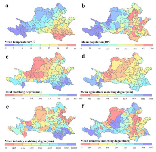 The spatial distributions of all relevant WLN factors for the 128 cities in the Huang-Huai-Hai River Basin from 1951 to 2017.(a), The spatial distribution of mean annual temperature; (b), The spatial distribution of mean annual population; (c), The spatial distribution of the mean annual total WLN matching index (Wt); (d), The spatial distribution of the agricultural WLN matching index (Wf); (e), The spatial distribution of the mean annual industrial WLN matching index (Wi); (f), The spatial distribution of the mean annual domestic WLN matching index (Wd).