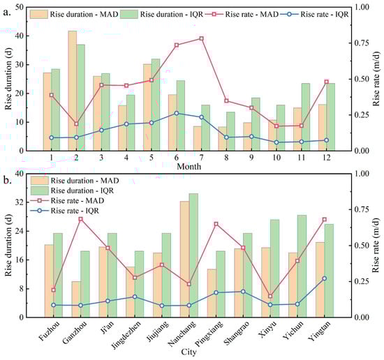- The results of the MAD and IQR methods for identifying AGLR were similar yet different. The MAD method identified more AGLR duration events, whereas the IQR method identified more AGLR rate events. The spatial and temporal distributions of these two AGLR event methods were similar. The abnormal threshold of the rising duration calculated by the IQR method was more significant than that of the MAD method. In contrast, the abnormal threshold of the rising rate was smaller than that of the MAD method.