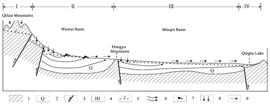 Shiyang River basin is in the east of Hexi Corridor of Gansu province (101°06′–104°04′ E, 37°10′–39°24′ N), the watershed area of which is 41,600 km2, and belongs to a typical continental temperate arid climate [52]. The topography of the basin is high in the south and low in the north, and the bedrock is mainly sandstone. Controlled by geological faults, several relatively independent water resource systems are formed in the basin: Qilian Mountains, Wuwei Basin, Minqin Basin, and Qingtu Lake (Figure 1). The quaternary strata in the basin are the main aquifer, and the lithology is mainly alluvial–diluvial sediments. The thickness of the quaternary in the Wuwei Basin reaches from 470 m in the south to 100 m in the north, and the thickness of the quaternary system in the Minqin Basin gradually changes from about 400 m to less than 200 m from south to north.