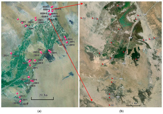 The map of field survey points. (a) Field ecological vegetation–groundwater–soil comprehensive investigation; (b) in situ monitoring sites of groundwater.