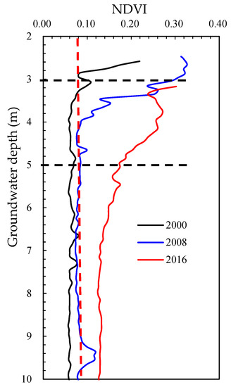 Jin’s research showed that vegetation is considered to develop when the NDVI is greater than 0.08 in the arid areas of northwest China [57]. It can be seen from Figure 5 that the NDVI is negatively correlated with the groundwater depth, and the NDVI gradually decreases with the increase in groundwater depth in the range of 1–5 m. According to the correlation curves between the NDVI and groundwater depth in 2000, 2008, and 2016, the following characteristics could be obtained: when groundwater depth was less than 3.0 m, the NDVI decreased rapidly with the increase in groundwater depth, indicating that it is most suitable for the growth of land surface vegetation which strongly depends on groundwater for survival; when groundwater depth was between 3.0 m and 5.0 m, the NDVI decreased slowly with the increase in groundwater depth, indicating that it can still provide water for parts of land surface vegetation; when groundwater depth was greater than 5.0 m, the NDVI was basically unrelated to groundwater depth. With the increase in groundwater depth, the NDVI was always limited in the range of 0.06–0.18. In this case, the vegetation was degraded and could only survive by precipitation or human irrigation. Therefore, in natural conditions, 3.0 m can be as the key threshold of groundwater depth that is most suitable for the growth of land surface vegetation, while 5.0 m can be as the key threshold of groundwater depth at which most vegetation growth is inhibited and begins to degenerate.