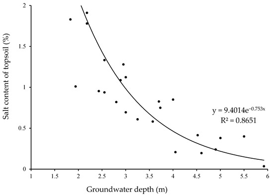 When the groundwater depth is too deep, the farmland mainly depends on artificial irrigation and has no relation to the groundwater. However, along with the natural wetland restoration process, the farmland around the natural wetland or with shallow groundwater depth in the lower reaches should be focused on the problem of soil salinization caused by the rise in groundwater level. In the classification index of soil salinization in China [59], the salinization degree is divided into five levels according to soil salt content (Table 5 and Figure 6). Studies have shown [60,61,62] that when the soil surface salt content reaches 0.3% of dry soil weight, salt-sensitive crops are slightly inhibited and their yields are affected. Once the soil salt content is greater than 2.0%, the growth of most crops is severely inhibited and crop yields are severely reduced. Based on the research of Wang et al. [50], the relationship between the groundwater depth and the total salt content of 0–20 cm surface soil was established. Thus, the corresponding groundwater depth could be deduced according to different salinization conditions of surface soil (Table 5). As can be seen from Figure 6, the shallower the groundwater depth was, the higher the salt content of surface soil was. On the contrary, the deeper groundwater depth was, the lower soil salt content was; when groundwater depth was greater than 5.0 m, farmland was not salinized, and once groundwater depth was less than 5.0 m, the farmland was salinized to a different degree, which affected the growth of crops and reduced the yield. Therefore, 5.0 m is the key groundwater depth threshold of surface soil salinization in the irrigated farmland area, and it is the maximum groundwater depth that can form salinized soil.
