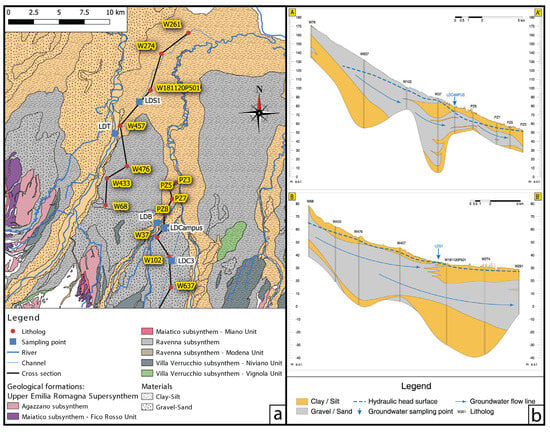 Geological and hydrogeological settings of the investigated area at large scale. (a) Geological chart of the region including the two subareas, with geological Formations and outcropping materials, modified from the Geological map of the Emilia-Romagna Region, 1:25,000 scale [35]. (b) Hydrogeological cross sections are reported in panel (a); the hydraulic head values were derived from Zanini et al. [30].
