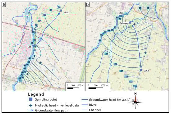 Groundwater net for the subareas. (a) Groundwater flowpath between LDT and LDS1, hydraulic head data from Lancini [32]; (b) groundwater flowpath between LDC3 and LDCAMPUS, hydraulic head data from Viani [31].