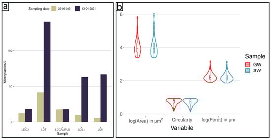 Microplastics characterization. (a) Microplastics occurrence (particles/L). (b) Microplastics’ geometric attributes in surface (SW) and groundwater (GW) samples; inside the violins, boxplots indicate the minimum and maximum values, lower and upper quartile, and median. Area and Feret diameter were log-transformed for graphical reasons.