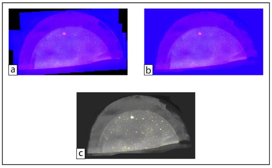 In addition, high-density solutions of K2CO3 can easily precipitate [41], forming crystals in the final processed sample. Despite that, these crystals had no consequences during fluorescence analyses (Figure 6), since they have no red color and were well-eliminated from the image during the color-splitting step in ImageJ (see detailed analysis protocol in the Supplementary Material). These macroscopic precipitates were associated with K2CO3 since they were not present in the previous stages of the analysis.