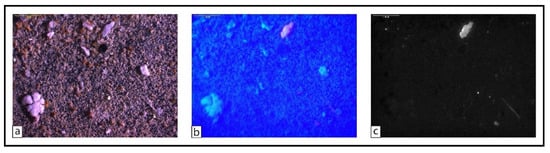 High-magnification image of an analyzed filter membrane. (a) Original image under normal light; the white object in the bottom-left corner is supposed to be K2CO3 precipitate. (b) Same filter portion under fluorescence conditions. (c) The final output from ImageJ (red channel).