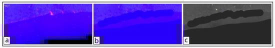 The filters were clipped in half as in Erni-Cassola et al. [40], but early cutting attempts of dry filters resulted in the loss of material. As an adjustment, filters were cut immediately after the Nile red solution application, which wetted the material over the filter and avoided its loss during the cutting phase. If used in a larger volume than necessary, it was observed that the Nile red solutions could dye the filter membrane’s borders. In this case, the filter image was modified in a raster graphics editor using a blue brush to correct these defects (Figure 7), which would otherwise be considered as microplastics by ImageJ. The blue color was preferred since it cannot result in false positives in ImageJ due to channel separation (see detailed analysis protocol in the Supplementary Material).