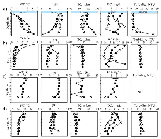 - Baatar, B.; Chuluun, B.; Tang, S.L.; Bayanjargal, O.; Oyuntsetseg, B. Vertical distribution of physical–chemical features of water and bottom sediments in four saline lakes of the Khangai mountain region, Western Mongolia. Environ. Earth Sci. 2017, 76, 130. [Google Scholar] [CrossRef]