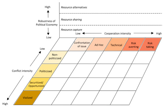 In the model, as shown in Figure 1 the first axis represents the different intensities of conflictual interactions, going from low conflictual intensity to violent interactions [29]. The different categories in increasing levels of conflict in Mirumachi’s scale are: non-politicized, politicized, securitized/opportunitized, and violized. Cooperative interactions are located on a second axis. Mirumachi has established the following increasing order for the different levels of cooperation: issue confrontation, ad hoc interaction, technical, risk-averting, and risk-taking. A third dimension, added later by Mirumachi and Allan [30], indicates the robustness of the political economy ranging from resource capture to resource sharing to resource alternatives.