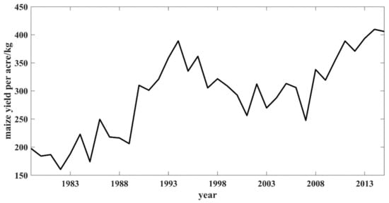The ensemble empirical mode decomposition (EEMD) method used to linearize and smooth the nonlinear and non-stationary signals [] has a significant advantage in dealing with non-stationary signals. The method can separate the fluctuations of different timescales and produce a series of intrinsic mode functions (IMFs) containing local characteristic information on different timescales of the original signal and residual (R), which retains the data in the process of decomposition characterization []. In this study, we employ the EEMD method to explore the multi-scale characteristics of crop yield fluctuations and their correlations between major influencing factors, which provide new insight into the impact of various climatic influencing factors on maize yield fluctuations at multiple timescales. This work helps in quantifying the impact of climate change on grain production variations, thereby providing support for reliable grain production forecasting. Maize is the crop with the largest planting area and production in China. In accordance with the FAO, the planted area of maize in 2016 was 36.8 million ha and production was 219.6 million tons []. The main crop in Heilongjiang Province is maize, which is also an important commodity grain production base in China. Consequently, this study selected maize yield in Heilongjiang Province as the research object. Moreover, since the overall trend in enhancing food production is predominantly caused by human activities (e.g., technological advances, fertilization, irrigation, etc.) [,], the impact of human activities on food production was also investigated in this study.