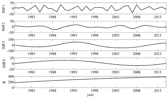 To explore the effect of climate change on maize yield in Heilongjiang Province, China at different timescales, multiple timescale analysis was performed using EEMD for maize yield during 1979–2015. Figure 2 exhibits the temporal change in original signal of maize yield. There was a clear upward trend in the temporal change (Mann–Kendall test value is 4.95). Figure 3 and Table 1 indicated the temporal changes in maize yield, and the average periods with their respective variance contributions at different timescales.