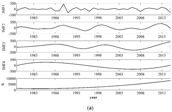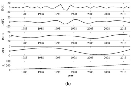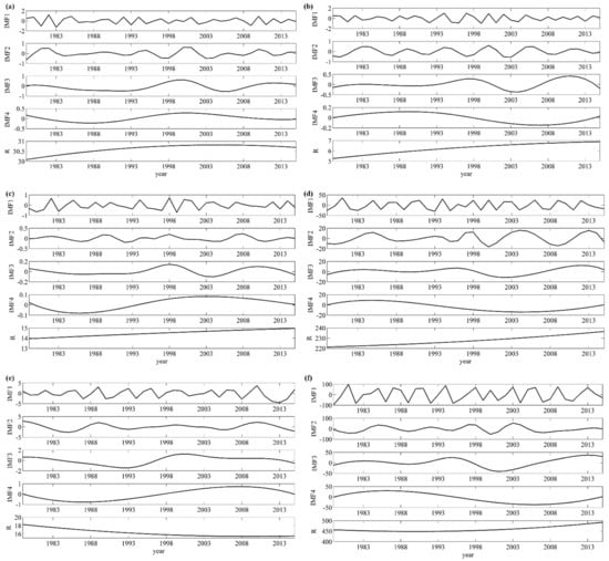 To reveal the changes in the effective irrigation area (EIA) and consumption of chemical fertilizers (CCF) at different timescales, multiple timescale analysis was performed using EEMD during 1979–2015. Figure 5 and Table 3 indicated the temporal changes, and the average periods with their variance contributions of EIA and CCF at different timescales.