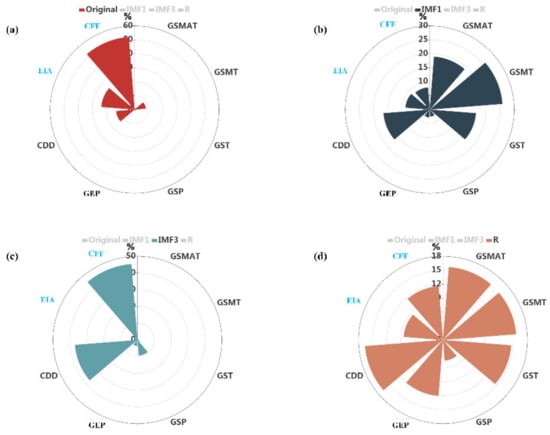 As shown in Figure 6, the factors sensitive to the original sequence of maize yield were GSMT, CDD, EIA, and CFF, the contributions of which to the variance of maize yield were more than 3%. In addition, the contributions of EIA and CFF to the variance of maize yield were significantly greater than CDD and GSMT, which indicated that maize yield was more sensitive to human activities than to climate change. However, it can be found that IMF1 of maize yield had more sensitivity to GSMAT, GSMT, GST, CDD, EIA, and CFF, among which the IMF1 was highly sensitive to GSMAT, GSMT, GST, and CDD than EIA and CFF, indicating that the short-term oscillation (3.1-year oscillation) of maize yield were more sensitive to climate change than human activities (shown in Figure 6). By contrast, there were some differences in IMF3 (18.5-year oscillation) of maize yield. At this timescale, there were only four factors, GSP, GEP, CDD, and CFF, to which IMF3 of maize yield was more sensitive. Notably, the long-term oscillation showed more sensitivity to GSMAT, GSMT, GST, GSP, GEP, CDD, EIA, and CFF, which illustrated that the trend component of maize yield was highly sensitive to climate change and human activities.