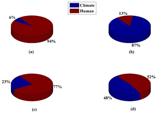 The relative contributions of human activities and climate change for maize yield over different timescales (original (a), IMF1 (b), IMF3 (c), and R (d)).