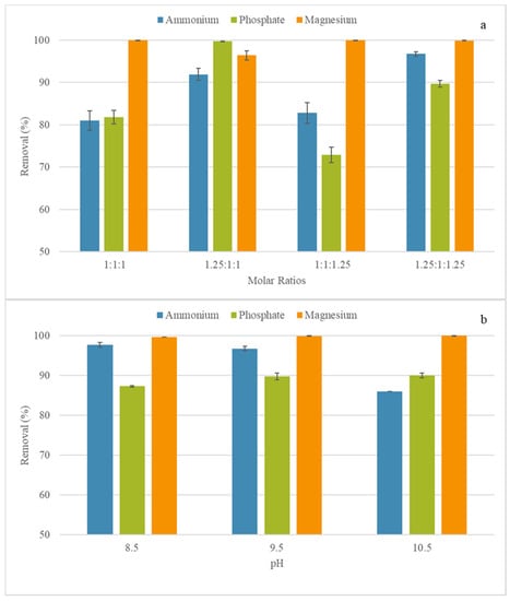 Ammonium, phosphate and magnesium removal rates vs. (Mg2+:NH4+:PO43−) molar ratios at pH = 9.5 (a) and vs. pH at molar ratios of 1.25:1:1.25 (b). The error bars represent ± one standard deviation for three replicate experiments.