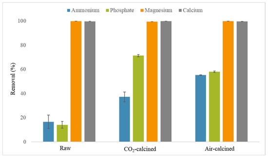The batch test experiment using raw dolomite resulted in an ammonium removal rate of approximately 17% (Figure 2). When CO2-calcined dolomite was used, the ammonium removal rate increased to approximately 37%, whereas, when air-calcined dolomite was used, the ammonium removal rate increased to approximately 55%. The removal rate of magnesium for all three conditions was approximately 100%. Conversely, the removal rates of phosphate were approximately 14%, 71%, and 58% for the raw dolomite, CO2-calcined dolomite, and air-calcined dolomite, respectively.
