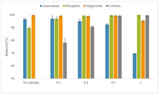 Ammonium, phosphate, magnesium, and calcium removal rates for the different treatment conditions using dolomite (Mg2+:NH4+:PO43− = 1.25:1:1.25; pH = 9.5). The error bars represent ± one standard deviation for three replicate experiments.