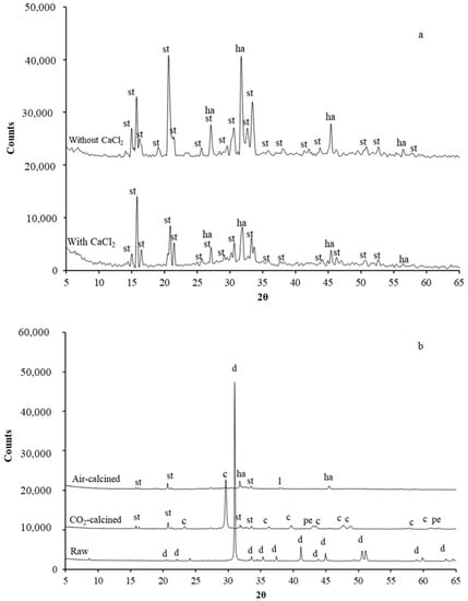 XRPD of the precipitates for the (Mg2+:NH4+:PO43− = 1.25:1:1.25; pH = 9.5) experiments using MgCl2, Na3PO4.12H2O, and CaCl2 as magnesium, phosphate, and calcium sources, respectively (a). And the experiments using dolomite under different pretreatment conditions (b). d = dolomite; c = calcite; pe = periclase; l = lime; po = portlandite; st = struvite; ha = halite.