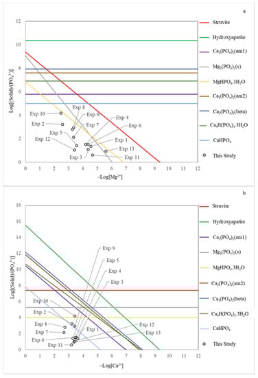 Activity ratio diagrams for: (a) PO43− solid phases vs. Mg2+. pH = 9.5, NH4+ = 0.0527 M, Ca2+ = 0.001 M; (b) PO43− solid phases vs. Ca2+. pH = 9.5, NH4+ = 0.0527 M, Mg2+ = 0.0026 M.