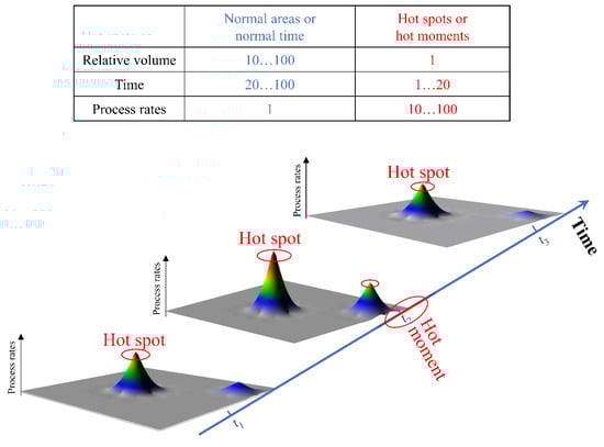 Reaction materials, an appropriate residence time, and a suitable temperature are all required for the production of HSHMs. The most typical hot spots occur at the juncture of hydrological flow paths carrying complementary reactive materials []. Hot moments usually take place when the hydrological flow path is reactivated or changed due to changes in the external environment []. Therefore, we often refer to the interfaces between streams and groundwater as biogeochemical HSHMs []. HSHMs may coincide or be mutually exclusive [].