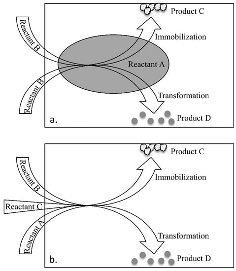 Figure 2 reveals the two primary mechanisms by which hot spots occur. Figure 2a indicates that there is a large amount of reactant A at a certain location, and it is possible that some condition stimulates reactant B to arrive at the location of A and then react with A. Figure 2b indicates that reactants A, B, and C meet at a location via transport and then react. Both cases have the potential to decay the reactants, convert the reactants to product D through biogeochemical reactions, or for both substances to form immobile substances C through adsorption or complexation. However, immobilization is a non-sustainable process; for example, a depletion of adsorption sites or desorption may occur []. Moreover, one of the main transformation mechanisms is biodegradation, which is the most desirable mechanism for contaminant removal []. For instance, Wallis et al. [] investigated an arsenic-containing aquifer in Hanoi where continuous groundwater extraction over many years led to water flow reverse, and the river began to recharge groundwater. As a result, the reaction of reactive organic matter in the river muds with electron acceptors in the Red River, such as O2, NO3−, and SO42−, led to the reductive dissolution of As-hosting Fe-oxides, creating a hot spot of arsenic release at the groundwater–surface water (GW–SW) interface.