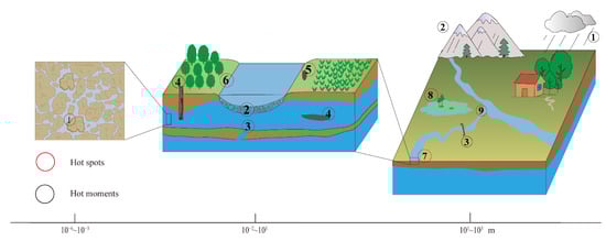 Locations and periods where and when HSHMs may occur on different scales. The red circles represent hot spots, and the black circles represent hot moments. In the red circles, 1 is microbial biofilms on sediment particles, 2 is the streambed, 3 is the confluence of shallow and deep groundwater, 4 is the interface between coarse and fine materials or sandy clay, 5 is the natural reduction zone, 6 is the riparian edge, 7 is the riparian zone, 8 is the wetland, and 9 is the confluence of two rivers. In the black circles, 1 is the precipitation, 2 is the snowmelt, 3 is the dam operation, and 4 is the groundwater abstraction. The horizontal axis below represents the scale corresponding to the locations of hot spots.