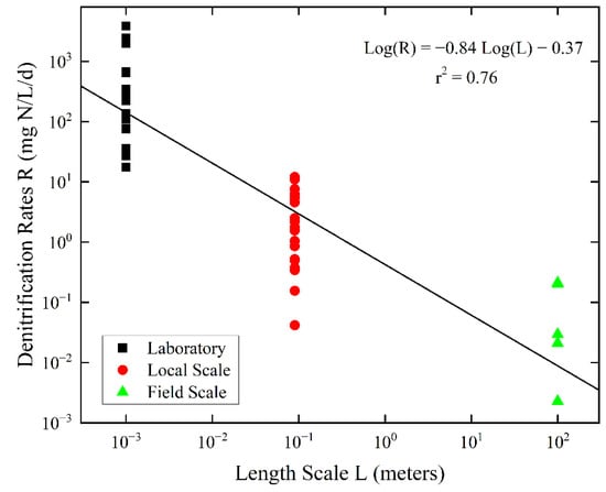 Denitrification rates on the laboratory, local, and field scales. The data in the figure are from Lansdown et al. [], Tesoriero and Puckett [], Karanasios et al. [], Böhlke et al. [], Tesoriero et al. [], Smith et al. [], and Korom [].
