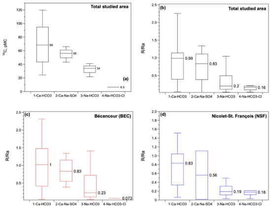 The different categories used for the Whisker plots are the chemical families of the waters which correspond to the progressive chemical evolution of groundwater caused by prolonged water–rock interactions over time, as identified by [39,40]. The numerals next to each boxplot are the median values calculated for each specific category. Although qualitative, this first-order statistical approach is useful to smooth variability and to show that with the progressive water ageing (represented by the progressive decrease in the 14C activity), progressive accumulation of radiogenic 4He, as well as a modification of the water chemistry, takes place. This latter results in chemical changes from bicarbonate in the recharge area to sodium-carbonate in the discharge areas by ionic exchange, and finally dissolution of the NaCl trapped in the Holocene clays deposited by the Champlain Sea (Figure 5) [41].