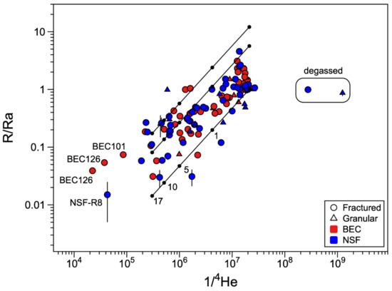 The classical “Craig’s plot”, where the 4He/20Ne ratios are plotted against R/Ra ratios (Figure 2) [51], provides a straightforward identification of the helium sources in terrestrial fluids, as well as the occurrence of mixing, usually represented by hyperbolas.