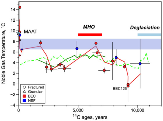Figure 7 reports the calculated NGT vs. the corrected 14C ages. The noble Gas temperatures are not only important as an independent continental climatic proxy, but they can also provide valuable information on how the aquifer’s recharge reacted during the glacial and interglacial periods in the past, providing a window into the future.