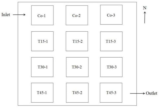 Experimental design field of the crab–rice field. Inlet is where the enclosure received water; the outlet is where the enclosure drained water. Co is the control group with no artificial feed supplied, and T15, T30, and T45 represent the treatment groups fed with experimental feeds of 15%, 30%, and 45% protein content, respectively.