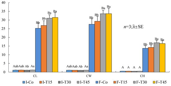 The morphological parameters of the crabs in the high- and low-protein diet groups varied significantly at each measurement (Figure 2). At the end of the experiment, the carapace length, width, and height of both T30 and T45 groups were significantly higher than those of the Co group (p < 0.05), and the carapace length and width were significantly higher than those in the T15 group (p < 0.05). The final body weight and weight gain rate of the crabs in the T45 group were significantly higher than those of the Co group (p < 0.05). The growth rate of the crabs in the Co group was significantly lower than that of the T30 and T45 groups (p < 0.05).