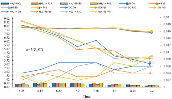 Water quality parameters of each enclosure during the experiment. The y-axis of NO2−-N is the secondary coordinate axis (right), and others correspond to the left primary coordinate axis.