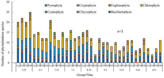 A total of 54 species of phytoplankton from seven phyla were detected in four treatments during the experiment (Table A4). Seven phyla were present in all treatments (Figure 4). Bacillariophyta was the dominant group, with 19 species present, and accounted for 35.19% of the phytoplankton species observed. Chlorophyta was the phylum with the second highest number of species (18 species) and accounted for 33.33% of the total number of species. Other groups included Cyanophyta (9 species; 16.67%) and Euglenophyta (5 species; 9.26%). The phyla Cryptophyta, Chrysophyta, and Pyrrophyta were represented by one species each and accounted for 1.85% of the total species.