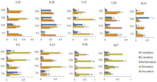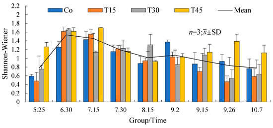 The phytoplankton diversity in each group was analyzed using the Shannon–Wiener diversity index (Figure 5), with an overall average of 1.07. The diversity index of the Co group was 0.59 to 1.43, with an average of 1.03. The diversity index of the T15 group was 0.46 to 1.62, with an average of 0.95. The diversity index of the T30 group was 0.54 to 1.65, with an average of 1.02. The diversity index of the T45 group was 0.93 to 1.62, with an average of 1.26.