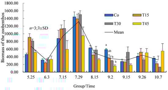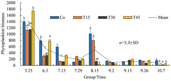 The phytoplankton biomass of different treatment groups over times was analyzed statistically. The overall average biomass of each experimental group showed a downward trend with time. However, an abnormal increase occurred for those in Co group on 15 August (Figure 6). On 25 May, the biomass in T45 was significantly higher than that in Co (p < 0.05). On 30 June, the biomass in T15 was significantly lower than that in Co and T45, while those in Co and T15 was significantly higher than that in T45 on 15 August (p < 0.05). The phytoplankton biomass in Co group was the lowest among all groups on 15 October (p < 0.05).
