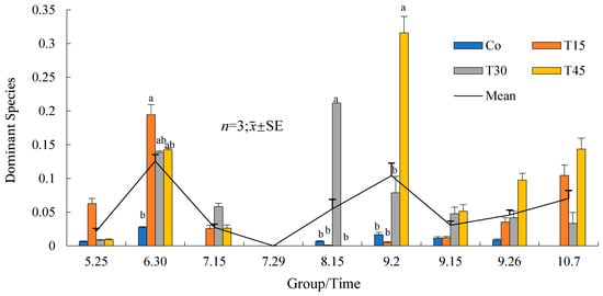 Chromulina pygmaea and Chlorella pyrenoidosa were highly dominant species in different treatment groups during the experiment. The diversity of dominant phytoplankton species in the Co group increased over time. Comparatively, the dominant species of each feeding group were relatively simple. In the later stage of the experiment, the degree of dominance of Chroococcus in the T30 and T45 groups was higher than that in the Co and T15 groups (Figure 8). On 2 September, the degree of dominance of Chroococcus in T45 was significantly higher than in the other groups (p < 0.05).