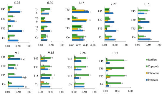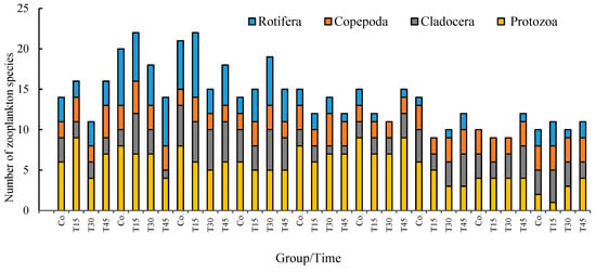 The zooplankton diversity in each group was analyzed using the Shannon–Wiener diversity index (Figure 10). The overall average value was 1.69. The diversity index was from 1.19 to 2.16 for the Co group (1.74 average), 1.15 to 2.31 for the T15 group (1.67 average), 1.00 to 2.18 for the T30 group (1.61 average), and 1.27 to 2.08 for the T45 group (1.73 average), respectively.