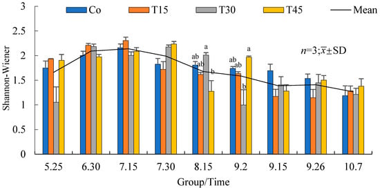 Shannon–Wiener diversity distribution indexes in different treatment groups during the experiment.