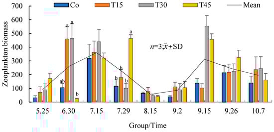 The total average zooplankton biomass in the paddy field fluctuated over time. There was an upward trend from the beginning of the experiment to 15 July, which then decreased to 15 August and increased to September 15 before decreasing again (Figure 11). The biomass of zooplankton in T45 was significantly lower than those in T15 and T30 on 30 June (p < 0.05), while the biomass in T45 was significantly higher than those in other groups on 29 July (p < 0.05).