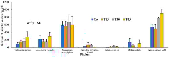 Species and biomass of aquatic vascular plants in different treatment groups during the experiment.