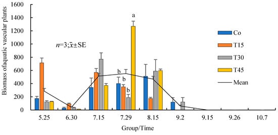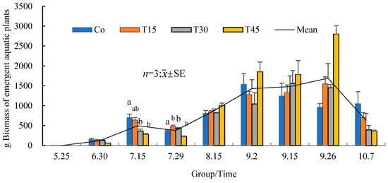 The changes of the submerged-plant biomass in different treatment groups over time are shown in Figure 14. The statistical analysis revealed significant variations in the biomass of submerged plants in each treatment group with different times. The overall submerged-plant biomass rapidly decreased to 30 June before rapidly increasing to 25 July and then increased gradually to 29 July and 15 August. The biomass in the T45 group was significantly higher than the other groups (p < 0.05). Afterwards, submerged-plant biomass rapidly decreased again. No submerged plant was found in all treatment groups from 15 September to 7 October.