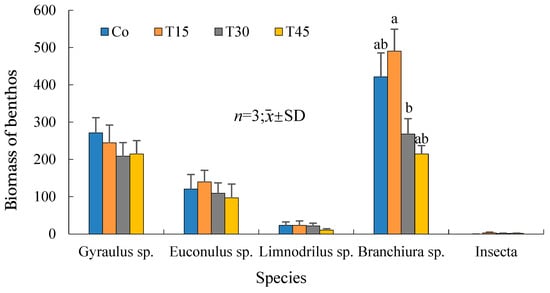 Species and biomass of benthos in the enclosures of each treatment group (n = 3; ± SD).