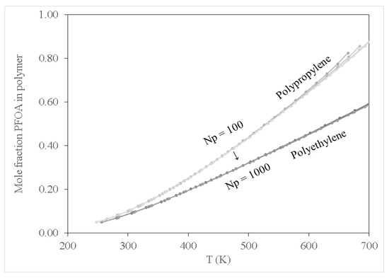 Effect of temperature on PFOA content of PP and PE with respect to the degree of polymerisation (Np).