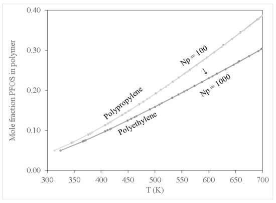 Effect of temperature on PFOS content of PP and PE with respect to the degree of polymerisation (Np).